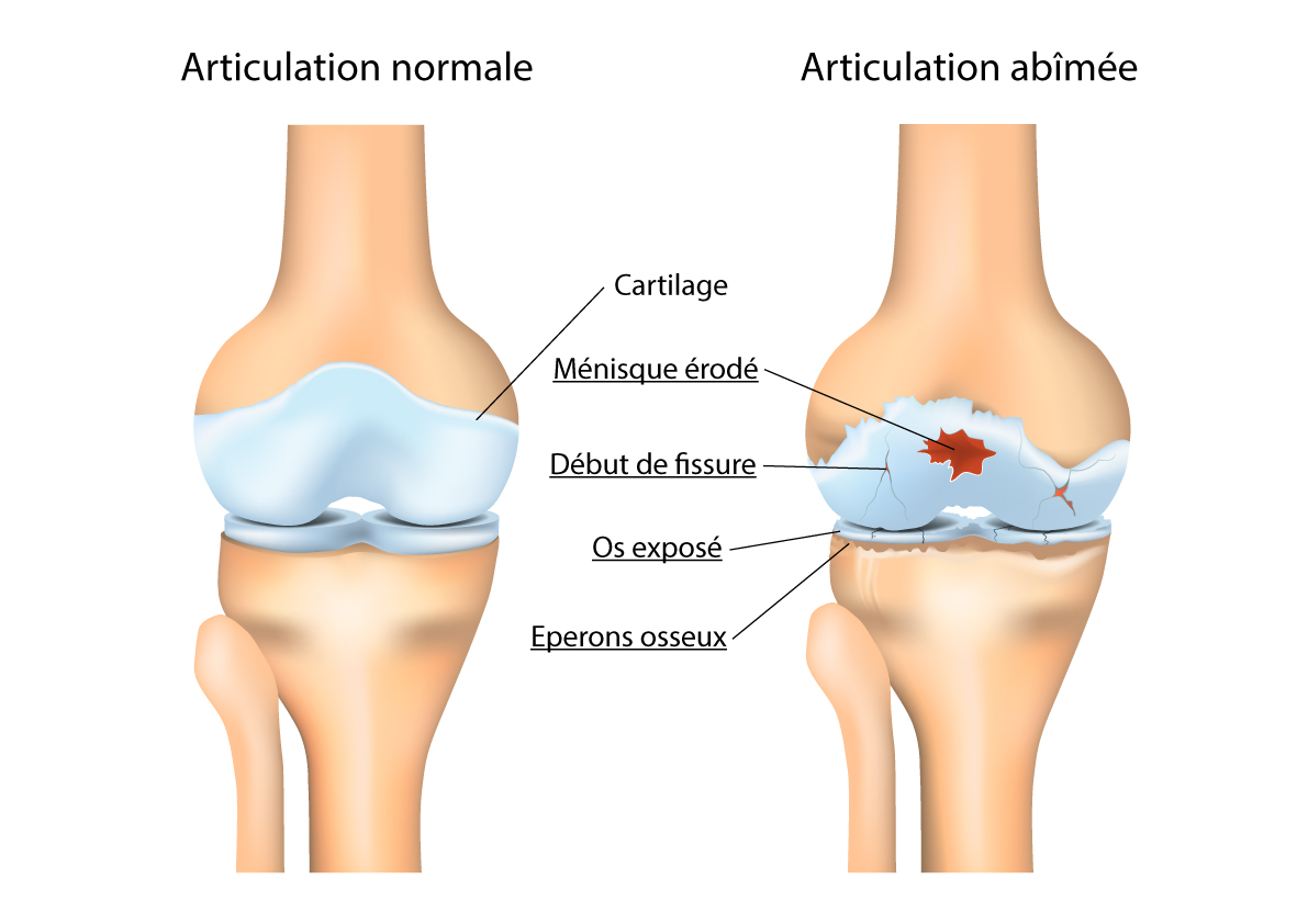 Petit à petit, les cartilages s’amincissent. En cas de mouvement, les os s’entrechoquent. Les douleurs arrivent.
